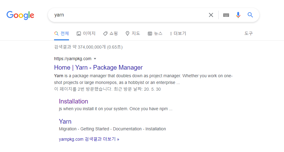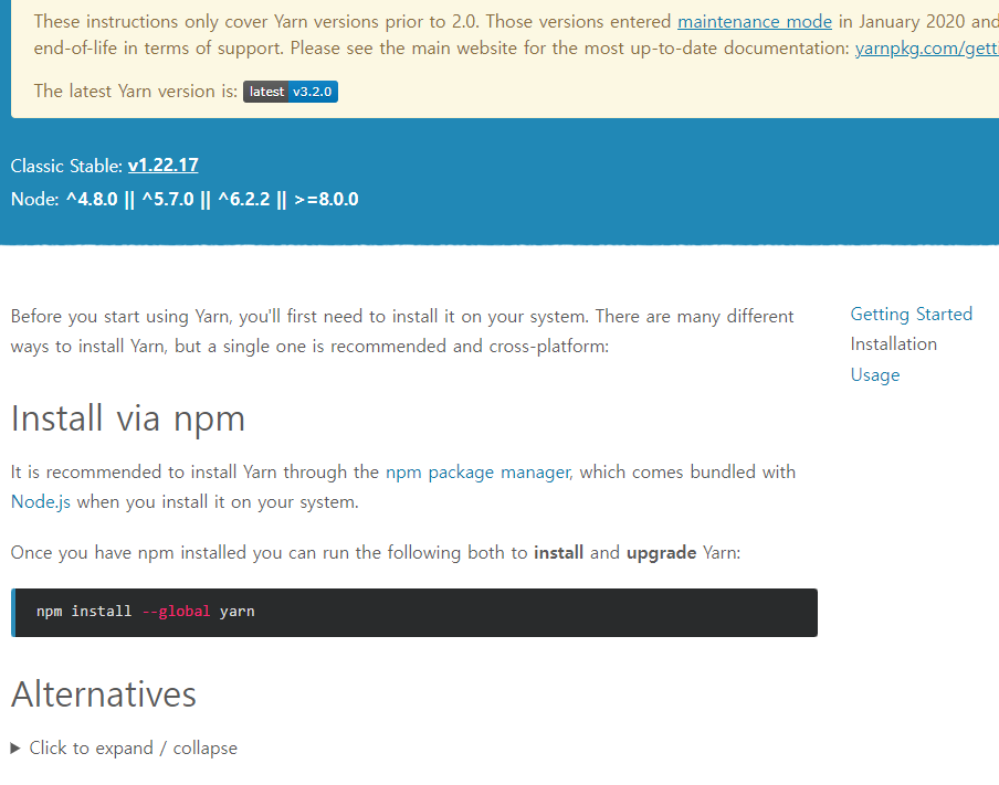 구글에 yarn을 검색하고 Installation을 눌러 진입하자!