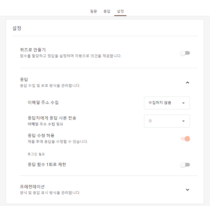 설정에서는 응답 횟수나 응답 수정을 할 수 있는지 없는지를 선택할 수 있다.