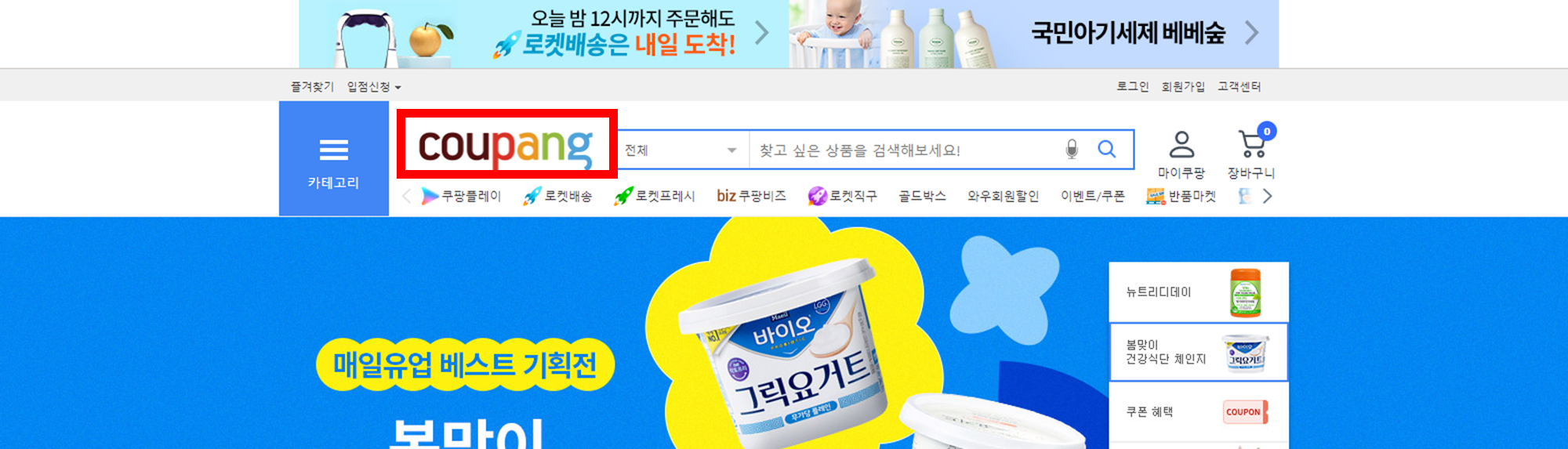 쿠팡의 모든 사이트에는 상단에 로고가 있으며, 로고를 누르면 메인 페이지로 이동한다.