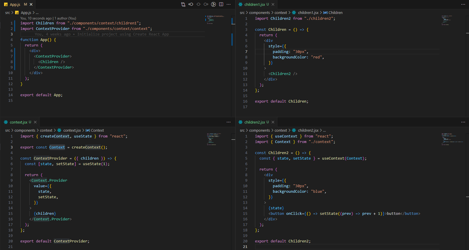 4개의 함수 컴포넌트로 구성되어 있는데, App, Context, Children1, Children2로 구성되어 있다.