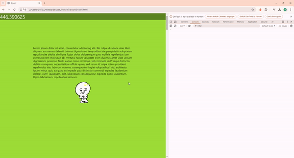 스크롤 이벤트가 발생 했을 때 캐릭터의 위치(showValue)를 확인하고 화면의 높이(innerHeight)의 1/4 위치보다 작으면 zoom 이라는 클래스를 줘서 캐릭터가 커지도록 작업했다.