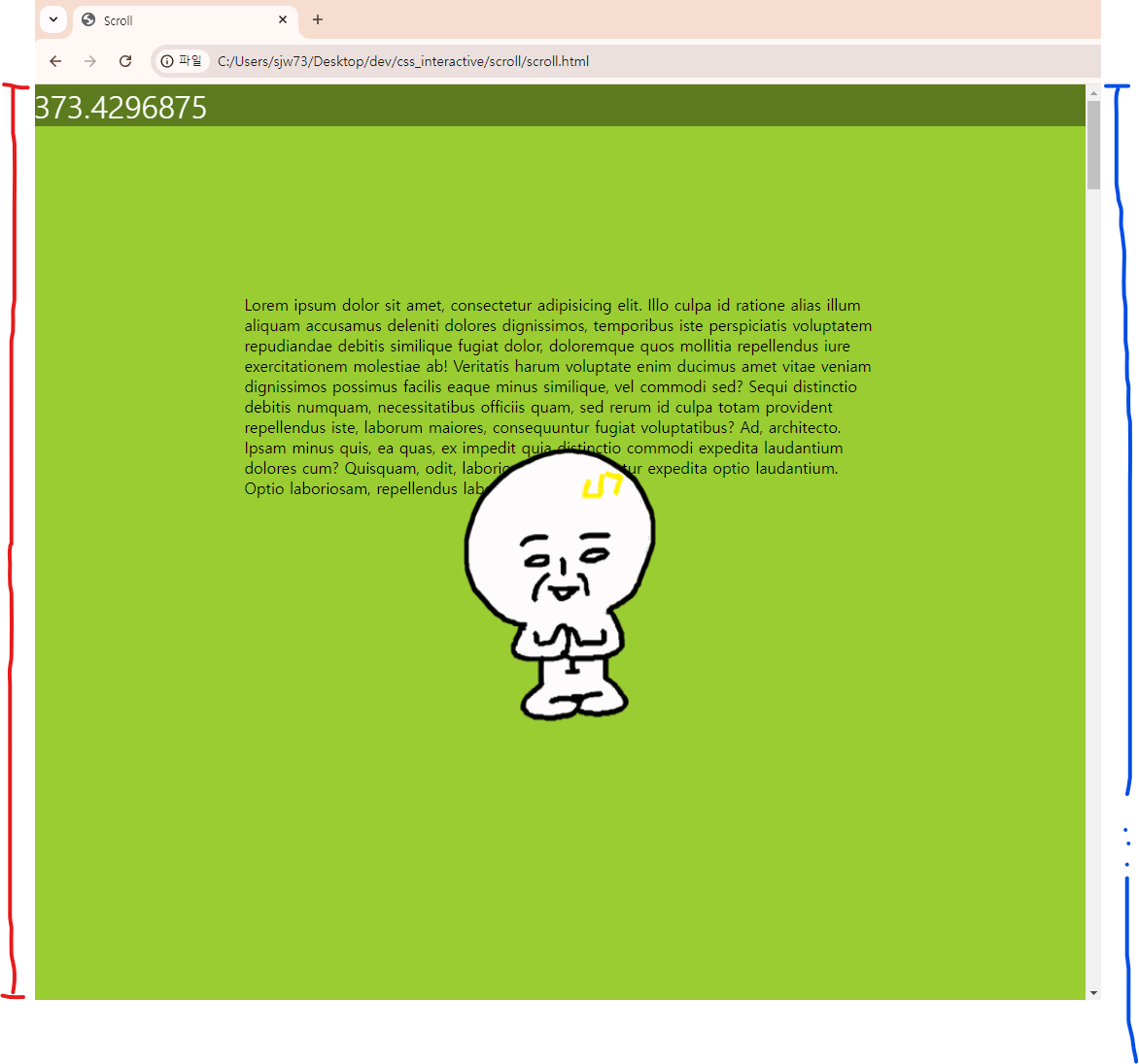 파란색 영역이 스크롤의 크기를 나타낸다면 붉은 영역이 innerHeight 보이는 영역의 높이를 나타낸다.