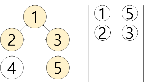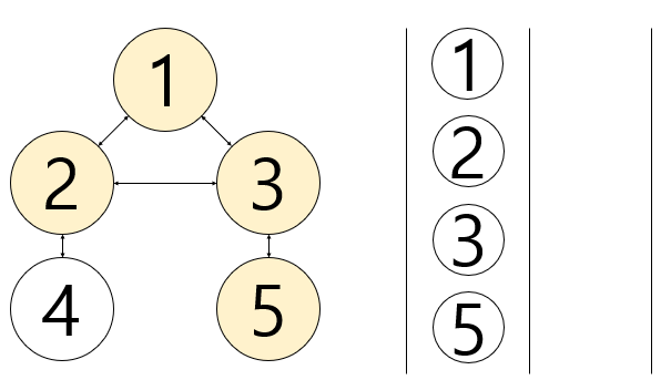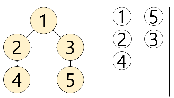 이렇게 모든 탐색이 종료되고 깊이 우선 탐색의 탐색 순서는 1 2 3 5 4 순으로 탐색이 이루어졌습니다.