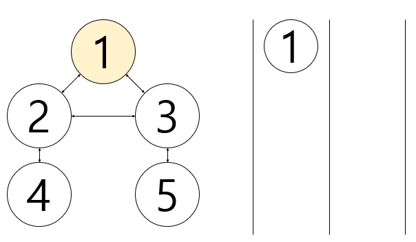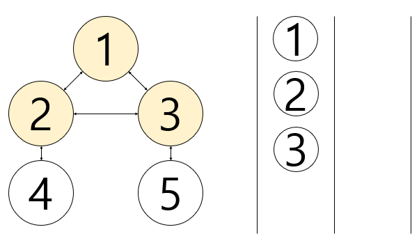 다음과 같이 1 2 3 4 5 가 서로 연결되어 있다고 보았을 때 깊이 우선 탐색을 해보자면