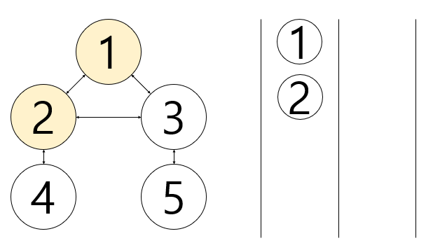 그 후 인접 노드 2를 스택에 넣어주고 방문처리를 해주었습니다.