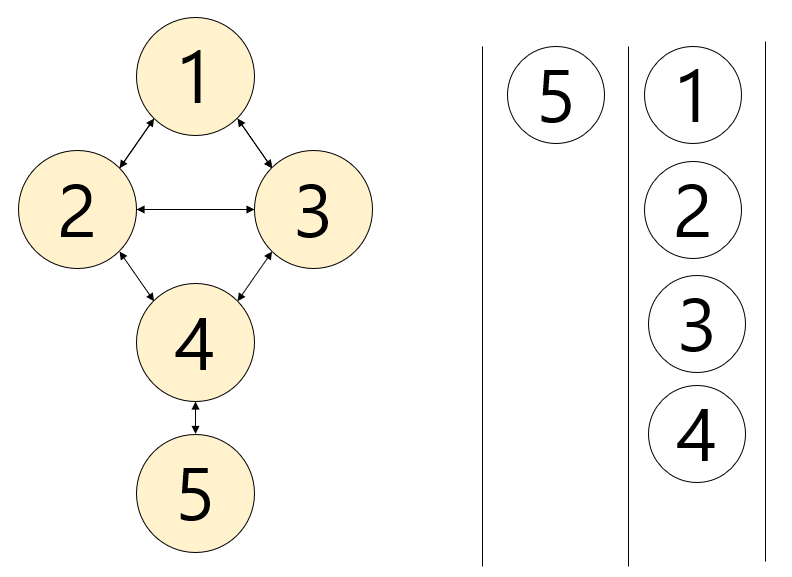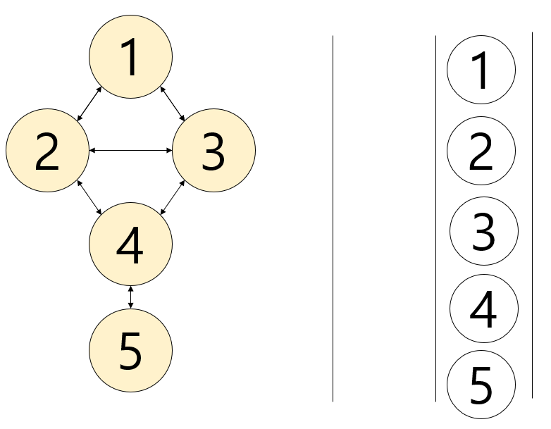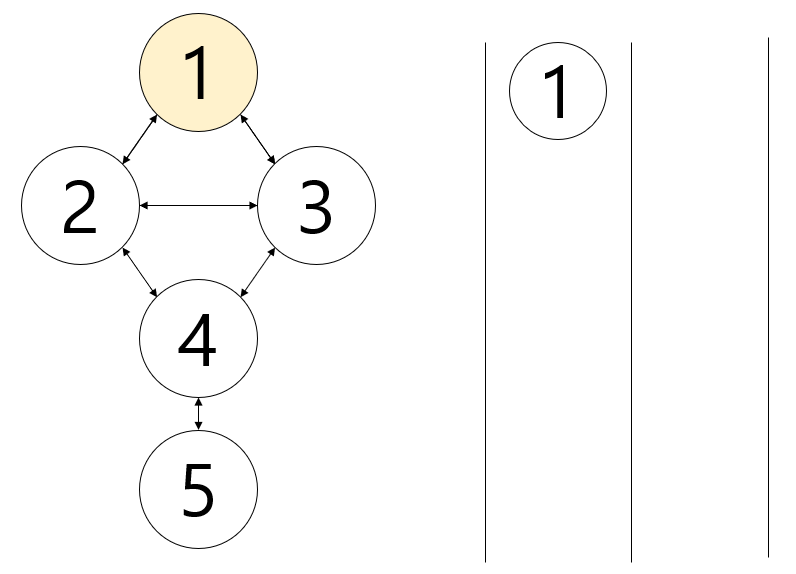 다음과 같이 1 2 3 4 5 가 서로 연결되어 있다고 보았을 때 너비 우선 탐색을 해보자면