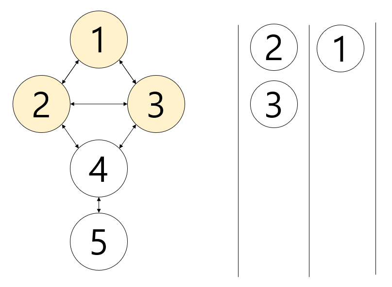 그후 시작 노드 1을 큐에서 꺼내고, 시작 노드의 주변 노드인 2와 3 모두 방문한 적 없기 때문에 큐에 넣어줍니다.
