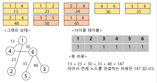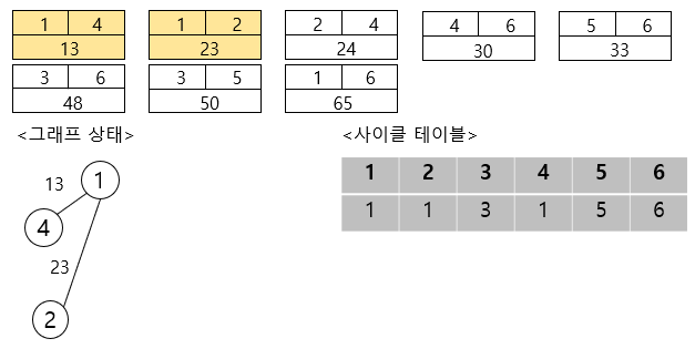 이렇게 사이클 테이블의 모든 값이 1이 되면서 최소 비용 신장 트리가 만들어진 것을 알 수 있습니다.