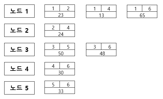 위와 같이 모든 간선들의 정보를 저장합니다. 노드 1부터 노드 7까지 연결된 모든 간선의 정보를 저장한 것입니다.