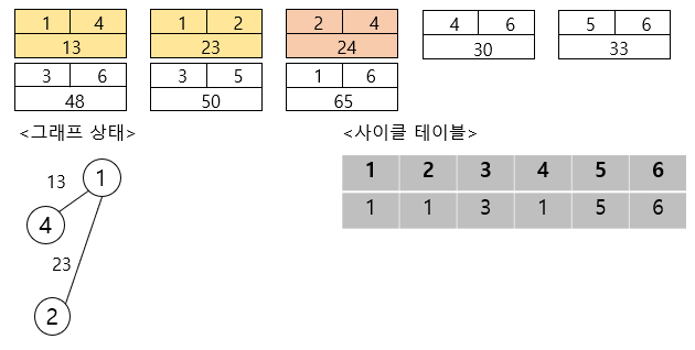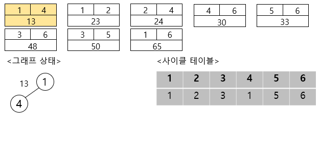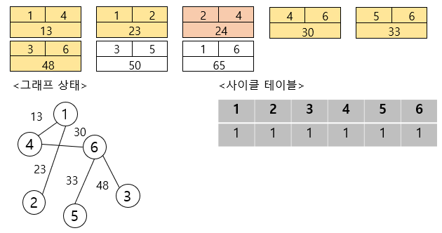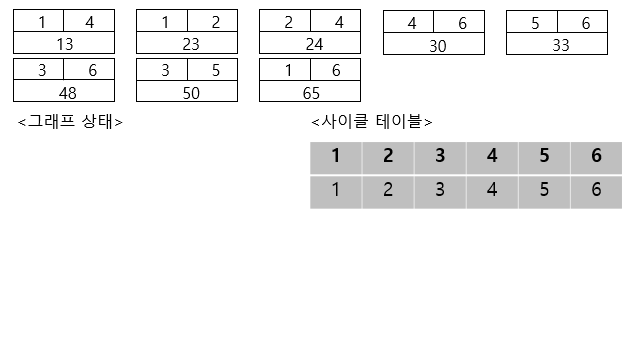 이제 첫 번째 간선을 선택하여 보면, ( 이때 사이클 테이블의 값도 동일하게 변경해줍니다.)