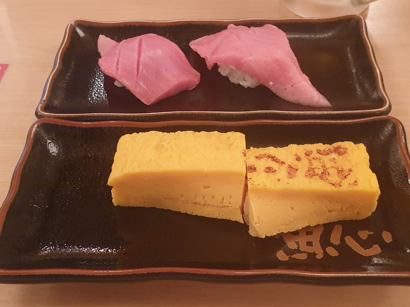 처음에는 계란 초밥과 참치 뱃살을 시켰다.
