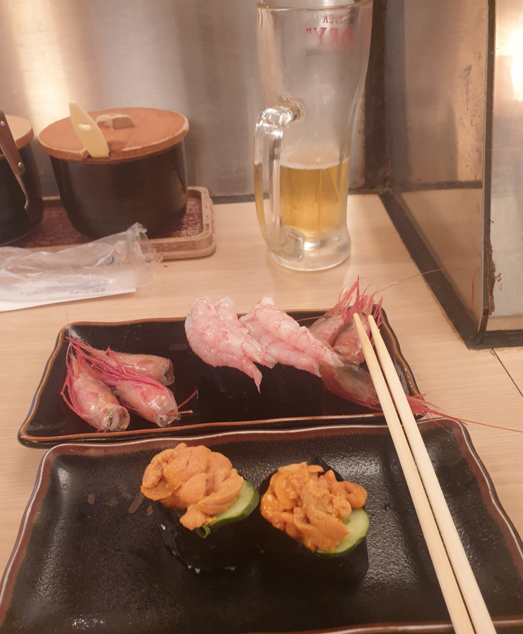 이후 계란 초밥을 하나 더 시키고 우니 초밥과 단새우 초밥을 추가로 시키고 먹었다.