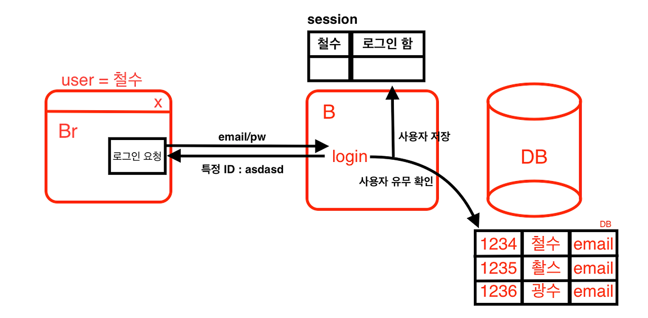 브라우저에서 email과 password를 가지고 로그인 요청을 백엔드로 보낸다면 백엔드는 해당 유저가 존재하는지 DB를 확인하고 있다면 session에 저장을 한다. session에 저장할 때 특정 id를 부여하는데, 브라우저에 response로 넘겨준다.