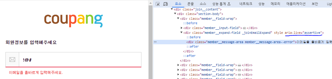 쿠팡의 경우 aria-live라는 속성을 사용하고 있다.