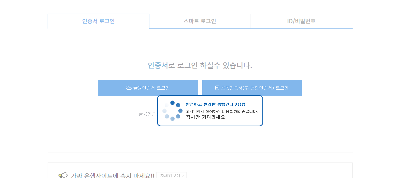 은행은 보안적인 이유로 로딩창이 나타난다. 로딩이 끝나면 보안 프로그램을 설치하라고 하는 화면이 나오는데