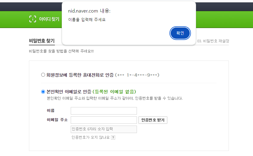 또 다음과 같이 오류 시 입력창 아래에 오류 문구가 나오는 경우가 있다.