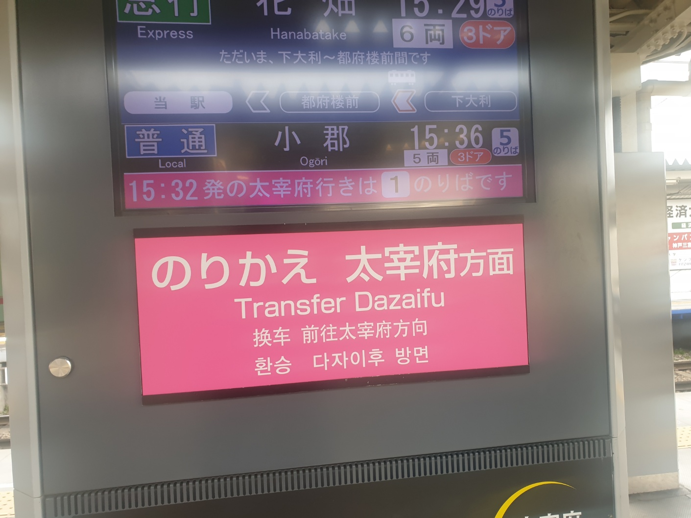 역에 도착하면 다자이후 방면 환승이라고 안내가 나와있다.