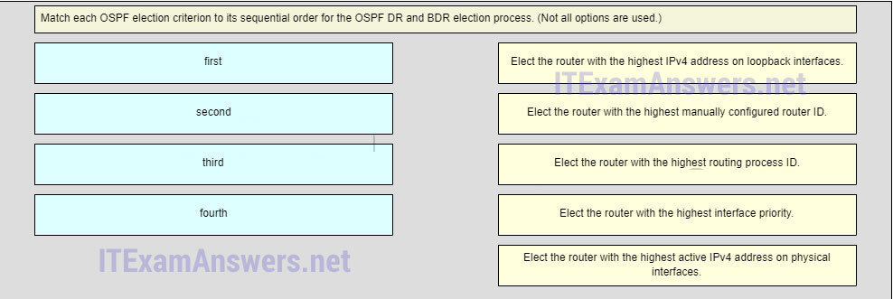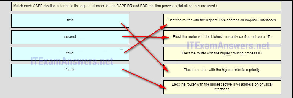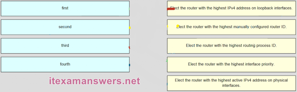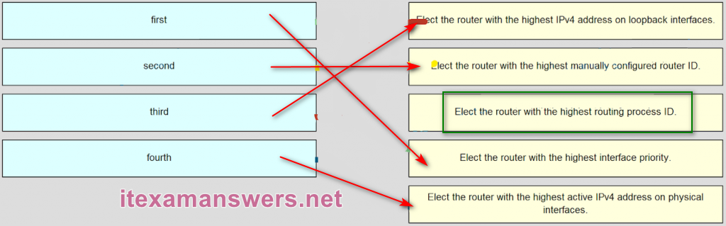 fourth ~~> 5.Elect the router with the highest active IPv4 address on physical interfaces.*