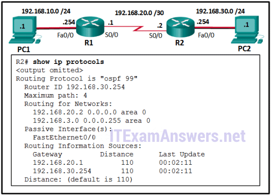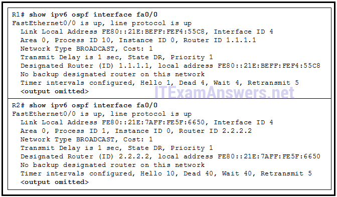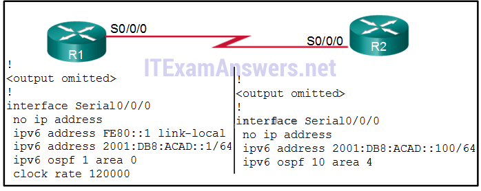 전시를 참조하십시오. R1과 R2는 동일한 LAN 세그먼트에 연결되며 OSPFv3를 실행하도록 구성되어 있다. 그들은 이웃의 부관을 형성하고 있지 않다. 문제의 원인은 무엇인가?