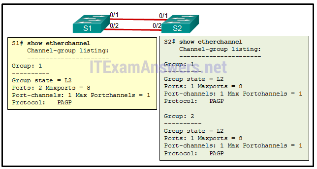 전시를 참조하십시오. 스위치 S1과 S2 사이에 EtherChannel이 구성되었지만 인터페이스가 EtherChannel을 형성하지 않는다. 무엇이 문제인가?