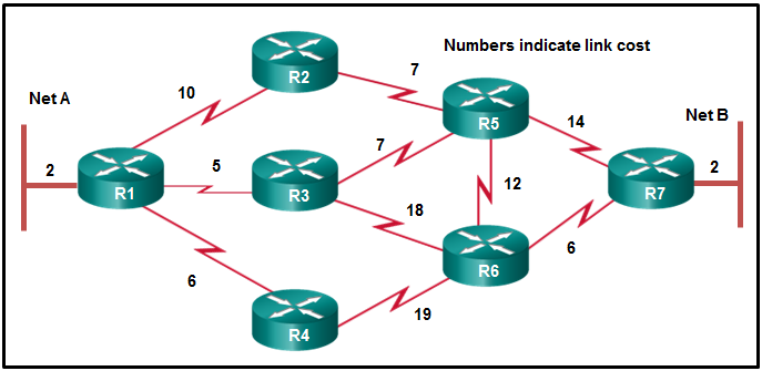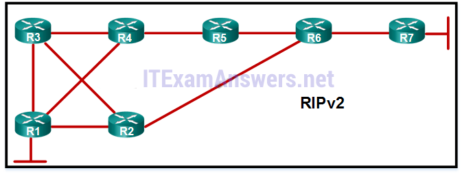 전시를 참조하십시오. 네트워크 관리자가 지정된 토폴로지에 RIPv2를 구성했다. R1에 연결된 LAN에서 R7에 연결된 LAN으로 패킷이 이동하려면 어떤 경로를 택해야 하는가?
