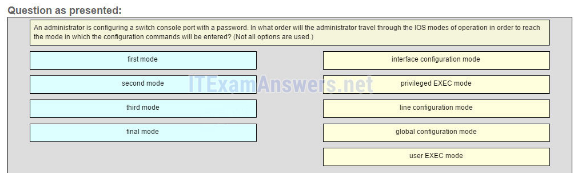 An administrator is configuring a switch console port with a password. In what order will the administrator travel through the IOS modes of operation in order to reach the mode in which the configuration commands will be entered? (Not all options are used.)