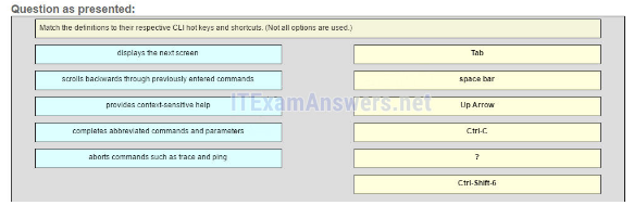 Match the definitions to their respective CLI hot keys and shortcuts. (Not all options are used.)