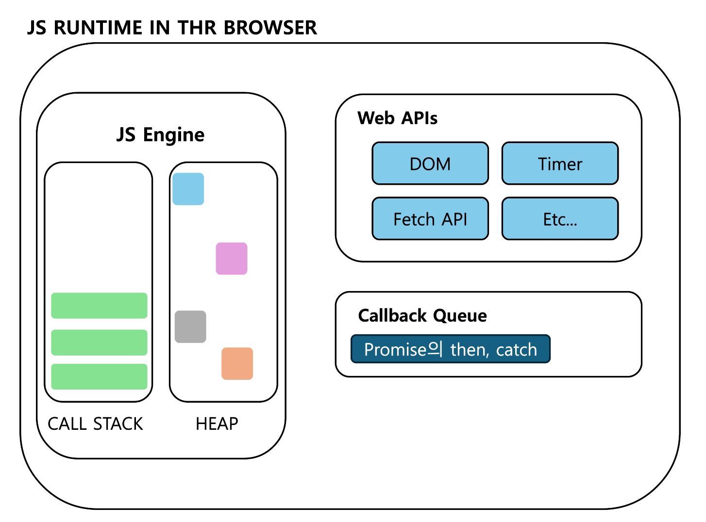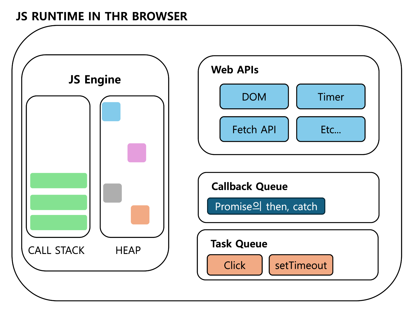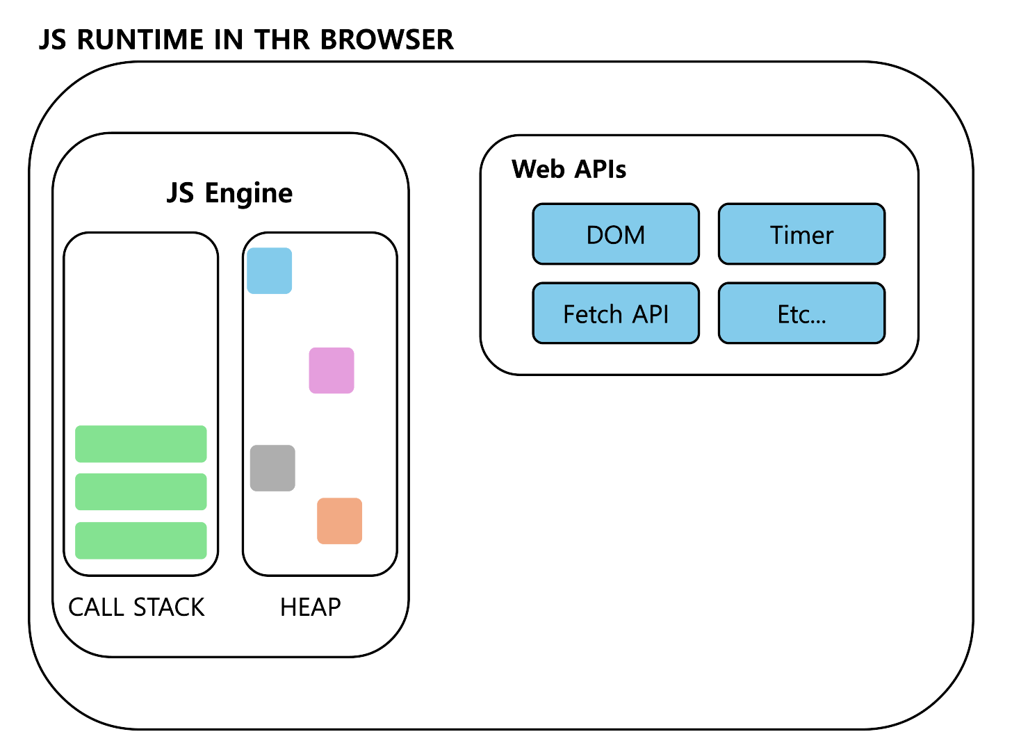 특히 웹 브라우저의 경우 JS 런타임에는 핵심 자바스크립트 언어 외에 추가 기능을 제공하는 Web API가 함께 제공된다. 이러한 API는 DOM, Fetch API, 타이머 등과 같은 상호작용이 포함된다.
