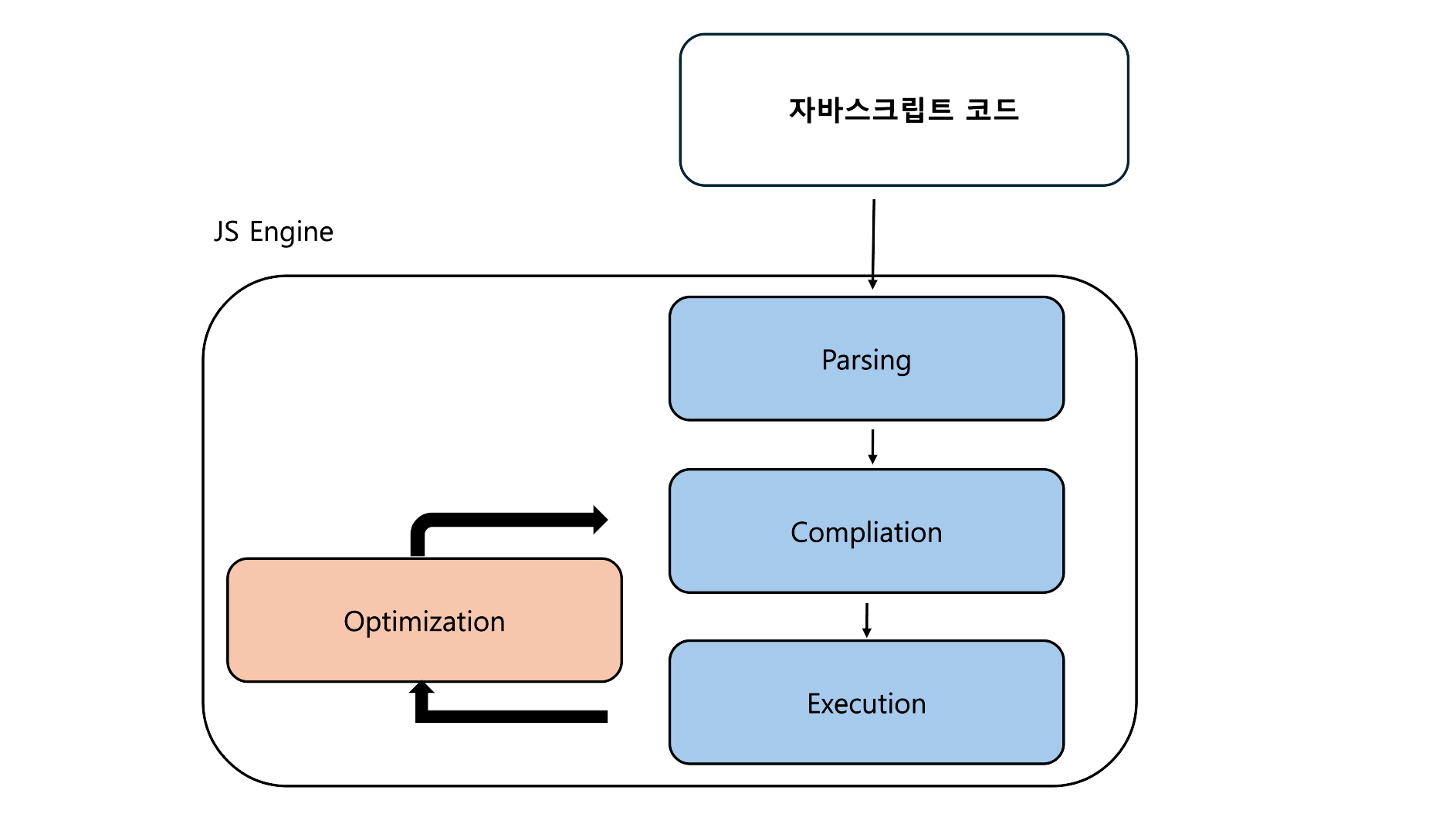 우리가 자바스크립트 코드를 작성하고 브라우저에서 실행을 시킨다고 코드가 바로 우리의 컴퓨터가 실행하는 것은 아니다. 대신, 자바스크립트 엔진이 코드와 기기 사이의 중개자 역할을 하면서 상호작용을 한다.