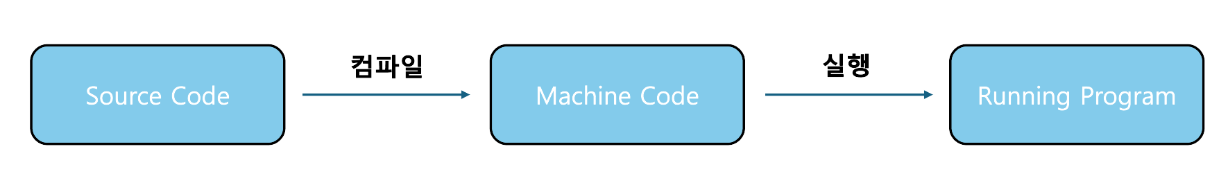 컴파일은 전체 코드를 한번에 기계어로 변환하여, 컴퓨터에서 실행 가능한 바이너리 파일로 만든다.