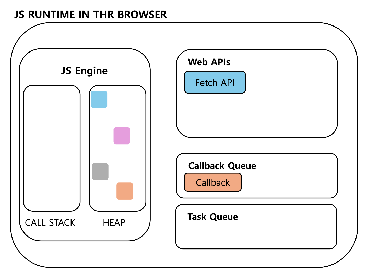 fetch는 비동기 함수이기 때문에 실제 네트워크 요청을 브라우저의 Web API에 위임한다.