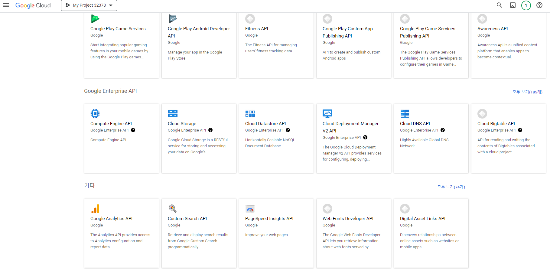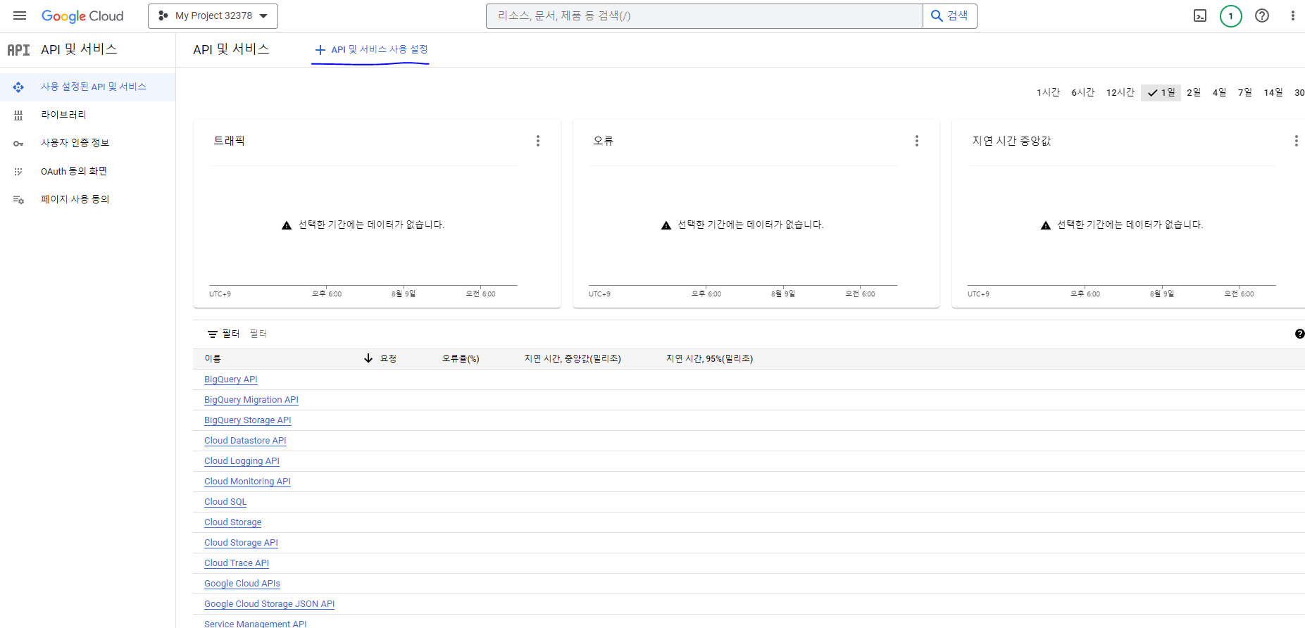 그리고 상단에 있는 API 및 서비스 사용 설정을 눌러 API 목록 화면으로 이동한다.
