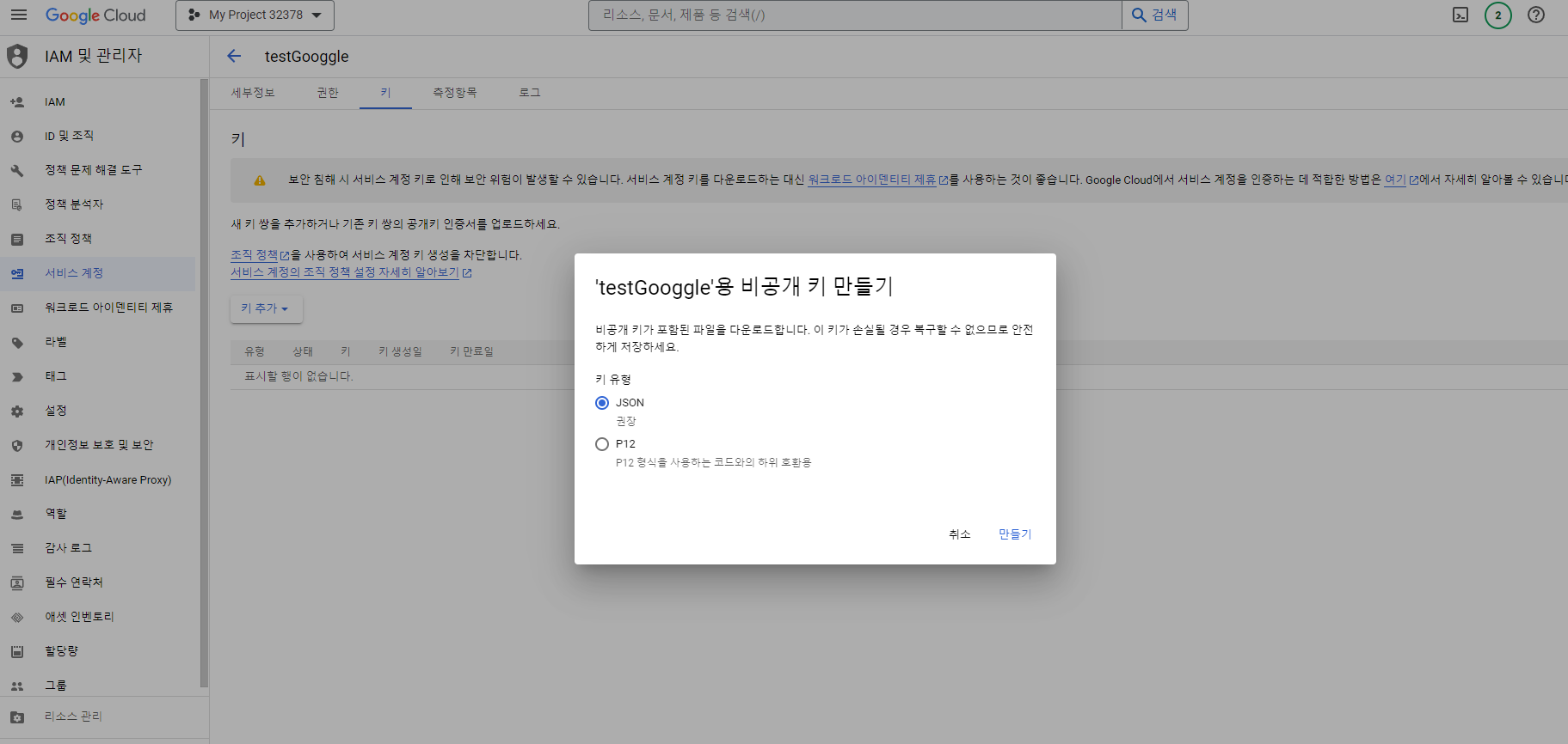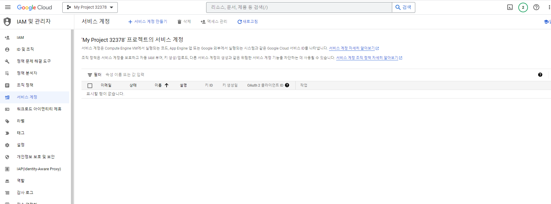 여기서 상단에 있는 서비스 계정 만들기를 눌러서 서비스 계정을 만들어 줄 것이다.