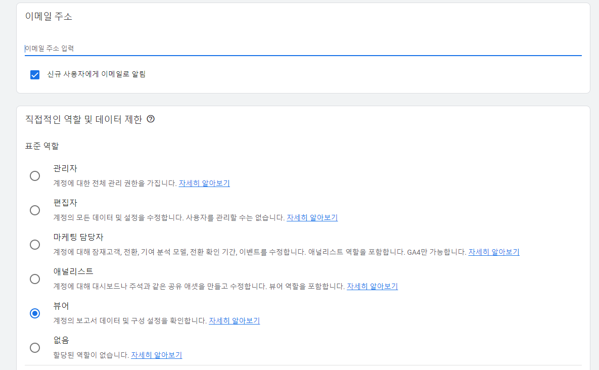 그러면 계정 액세스 관리 창이 나올텐데 우측 상단에 있는 액세스 권한 추가 버튼을 눌러서 새로운 액세스를 만들어준다.
