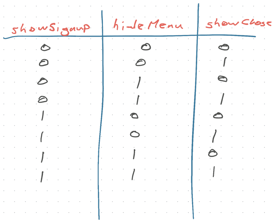해당 코드를 봤을 때 hideMenu, showSignup, showClose가 어떤 경우에 변하는지 알 수 있을까?