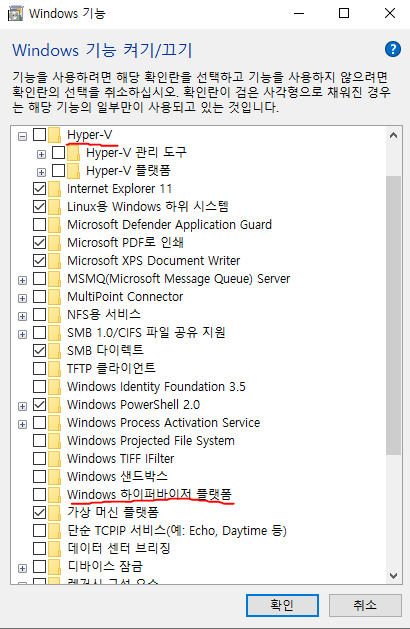 제어판 => 프로그램 => Windows 기능 켜기/끄기에서 Hyper-V와 Windows 하이퍼 바이저 플랫폼 부분을
