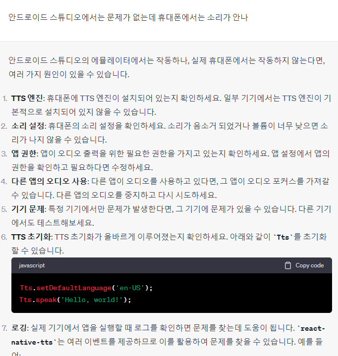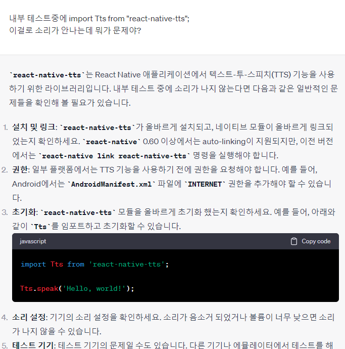 내부 테스트중에 import Tts from "react-native-tts"; 이걸로 소리가 안나는데 뭐가 문제야?