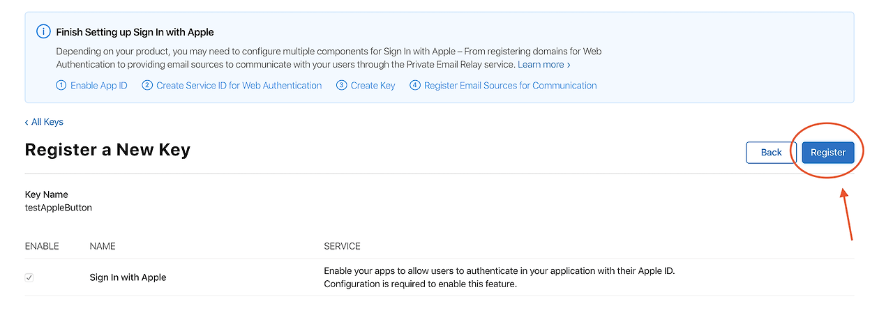 Key Name과 Sign In with Apple을 선택해준다. 그리고 Configure을 들어가서 앞서 만들었던 Identifiers를