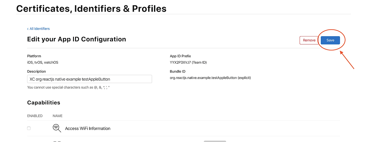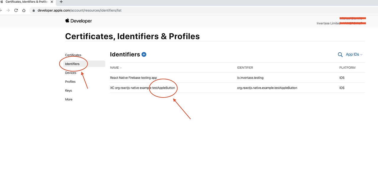 identifiers를 설정해줘야 하는데 없다면 파란색 + 버튼을 눌러서 App ID를 만들어준다.