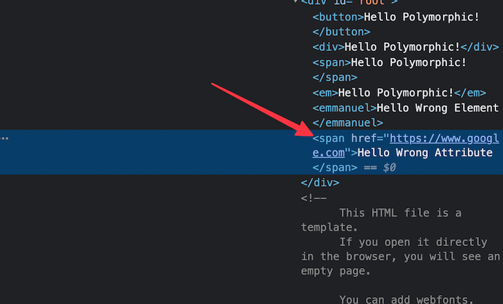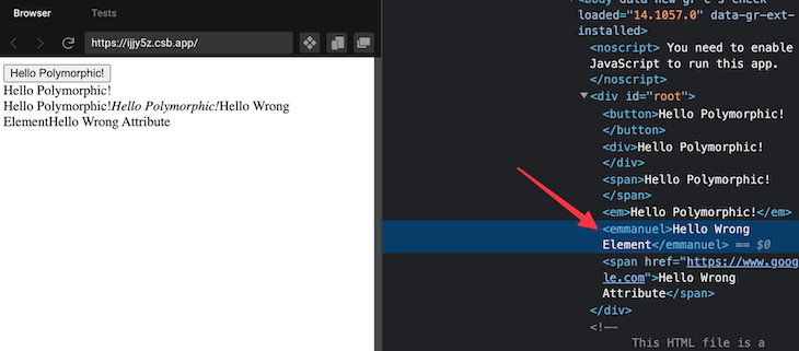 <MyComponent as="emmanuel">Hello Wrong Element</MyComponent>