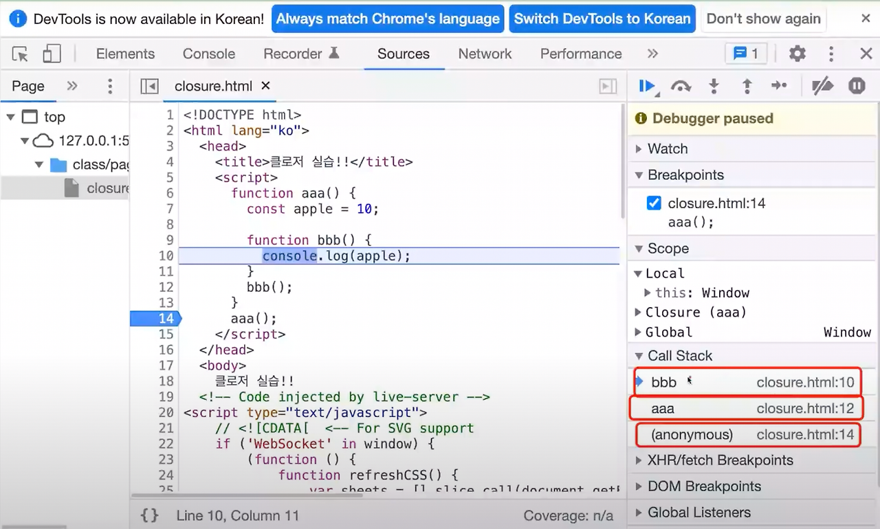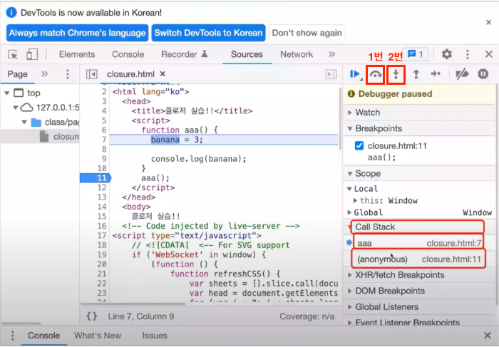 aaa 함수에 브레이크 포인트를 걸어두고 함수 안으로 들어오면 Call Stack에 aaa 함수가 쌓여있다.