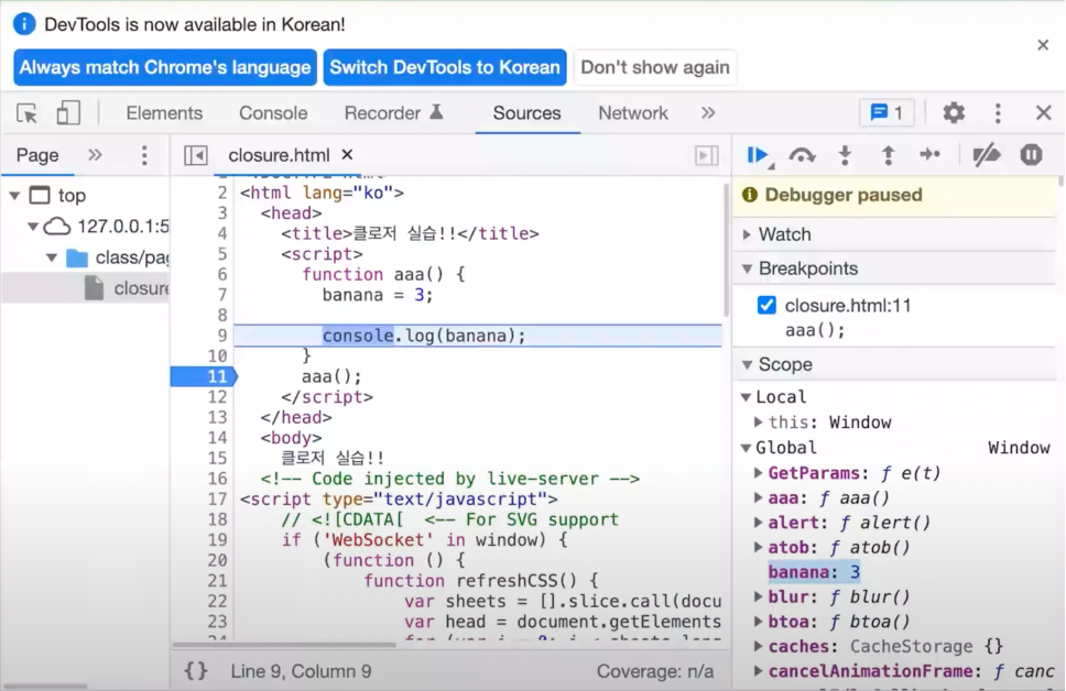 const 나 let으로 변수를 할당해준 것이 아닌 전역의 banana를 3으로 값을 할당했기 때문에 스코프의 글로벌 부분에 할당된 것을 확인할 수 있다.