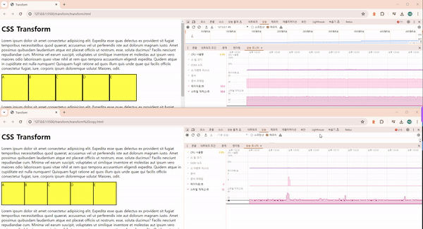 위가 width와 height을 사용하는 방식이고 아래는 transform을 사용하는 방식이다.