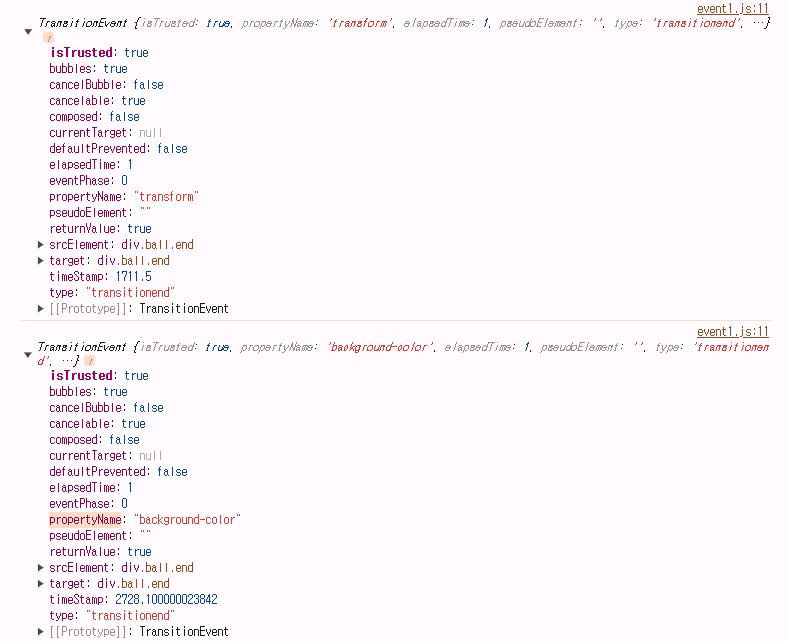 elapsedTime은 해당 요소에서 설정된 transition-delay를 나타낸다. css를 통해 transition: 1s를 설정했기 때문에 1이 반환된다.